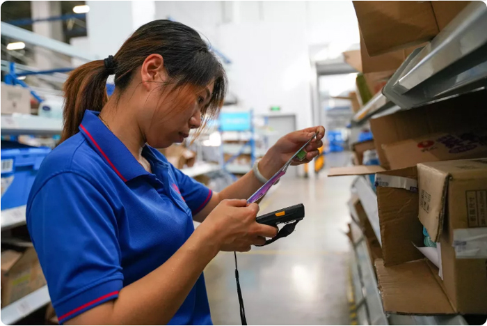 仓库上架组到岗,熟练地操作着叉车,将收来的货品第一时间上架到相应库位。七米高的货架、迷宫式的仓库,没有专业熟练的业务能力根本无法应对。